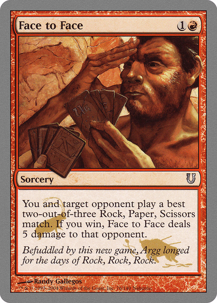 You and target opponent play a best two-out-of-three Rock, Paper, Scissors match. If you win, Face to Face deals 5 damage to that player.