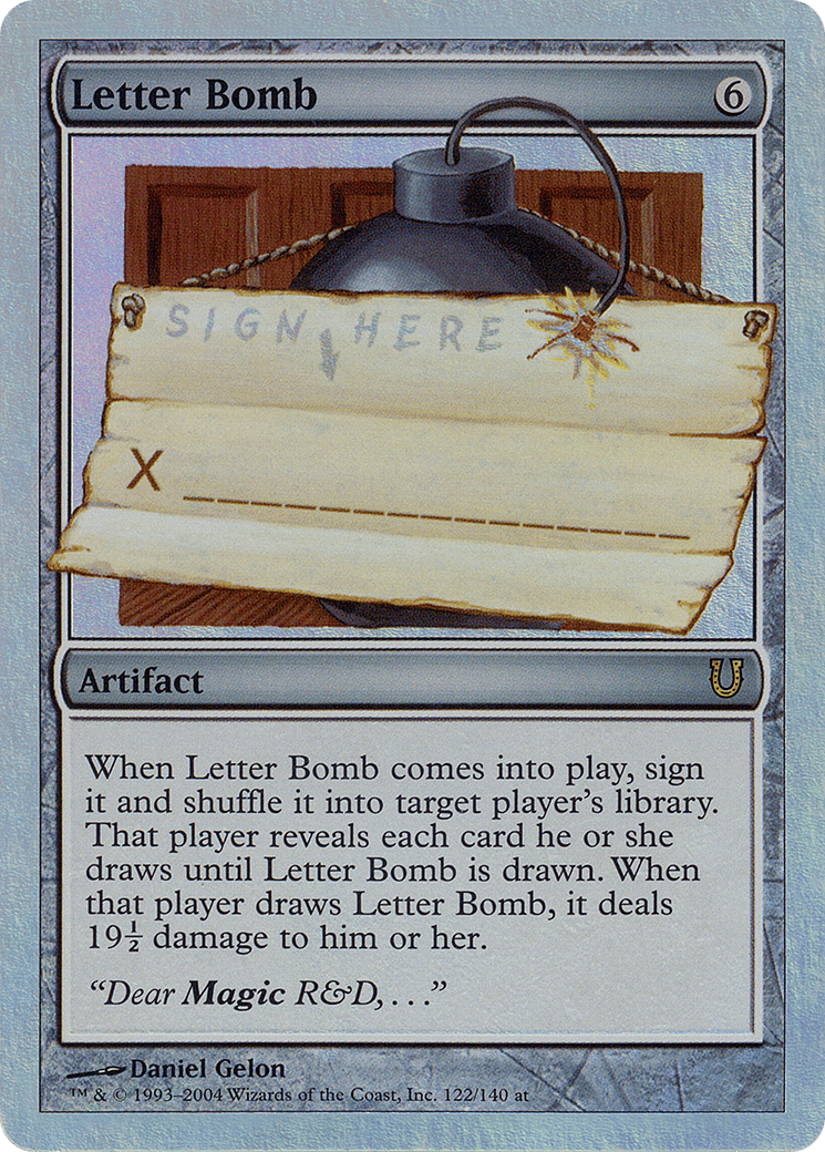 When this artifact enters, sign it and shuffle it into target player’s library. That player reveals each card they draw until they draw this card. When that player draws this card, it deals 19½ damage to them.