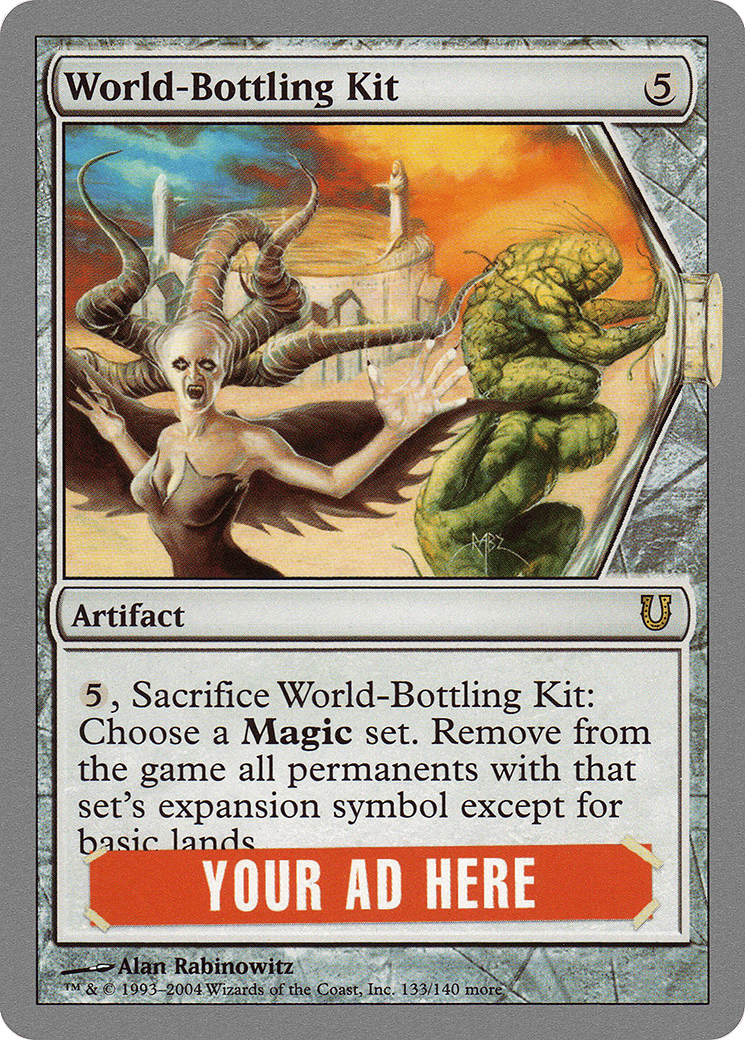 {5}, Sacrifice this artifact: Choose a Magic set. Exile all permanents with that set’s expansion symbol except for basic lands.