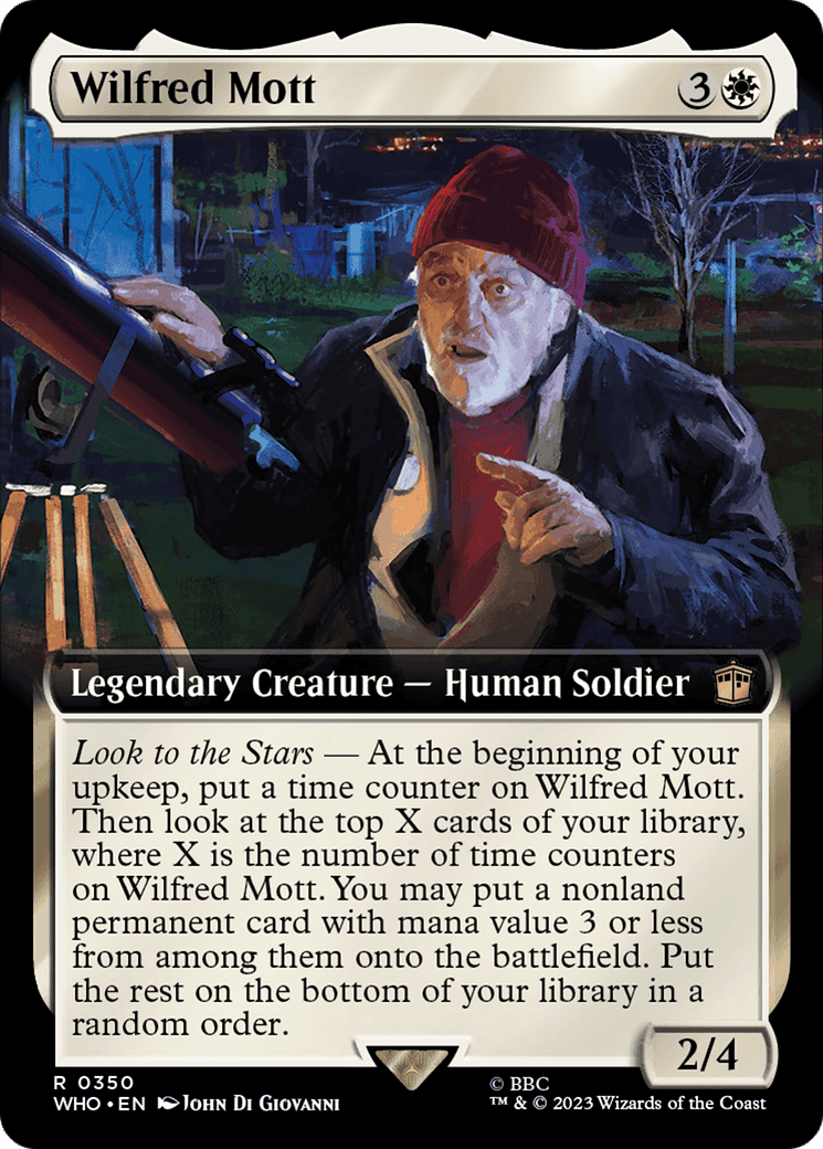 Look to the Stars – At the beginning of your upkeep, put a time counter on Wilfred Mott. Then look at the top X cards of your library, where X is the number of time counters on Wilfred Mott. You may put a nonland permanent card with mana value 3 or less f
