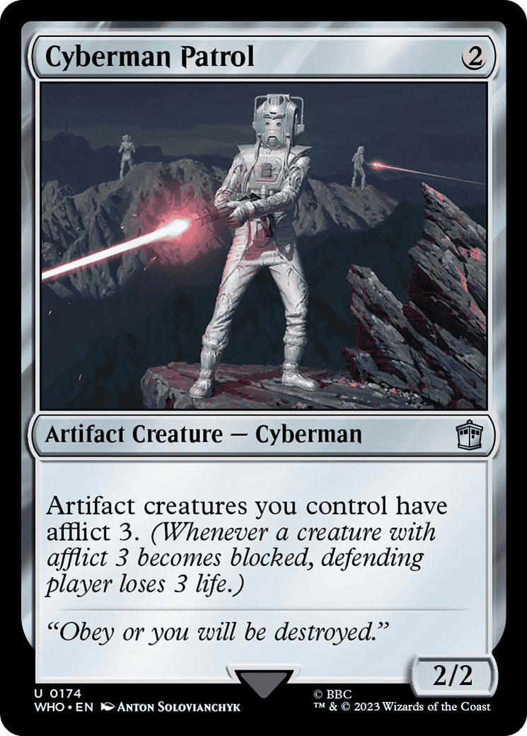Artifact creatures you control have afflict 3. (Whenever a creature with afflict 3 becomes blocked, defending player loses 3 life.)