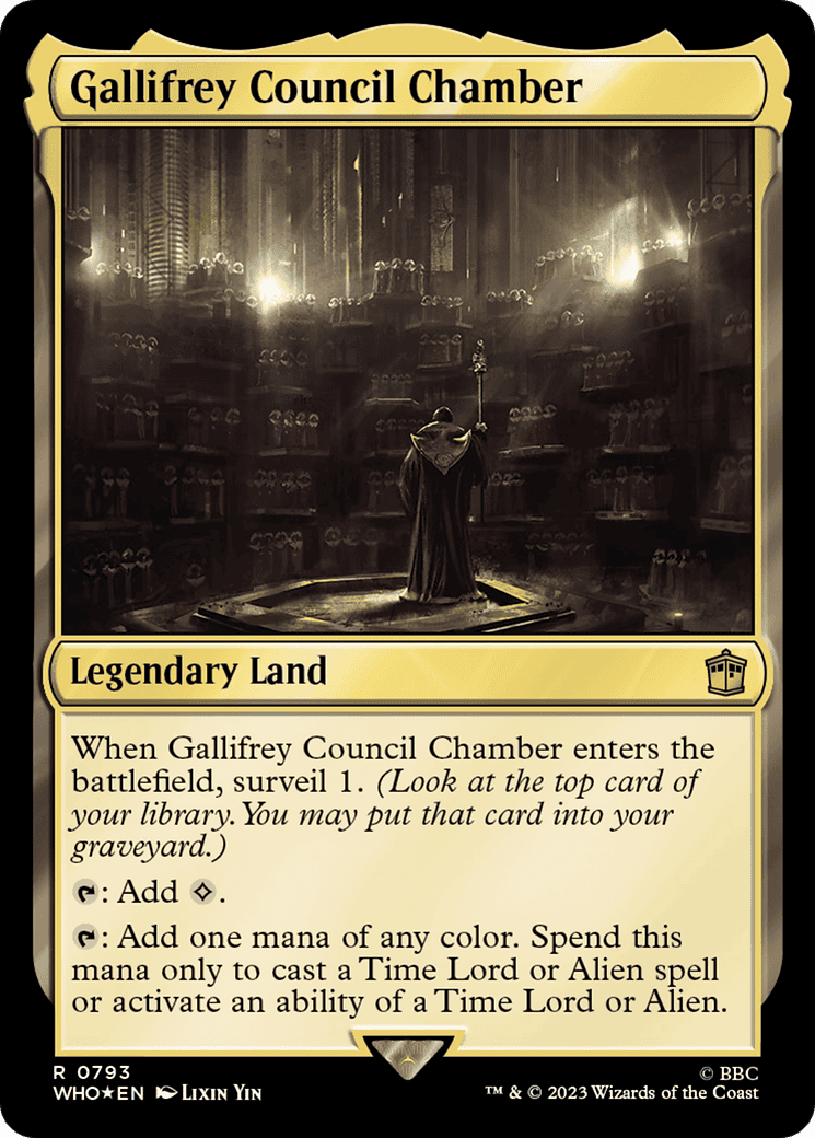 When Gallifrey Council Chamber enters, surveil 1. (Look at the top card of your library. You may put that card into your graveyard.)