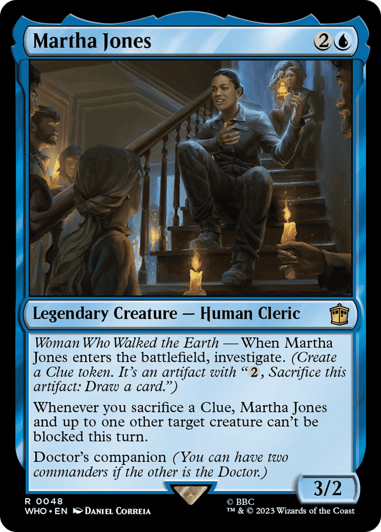 Woman Who Walked the Earth – When Martha Jones enters, investigate. (Create a Clue token. It’s an artifact with “{2}, Sacrifice this token: Draw a card.”)