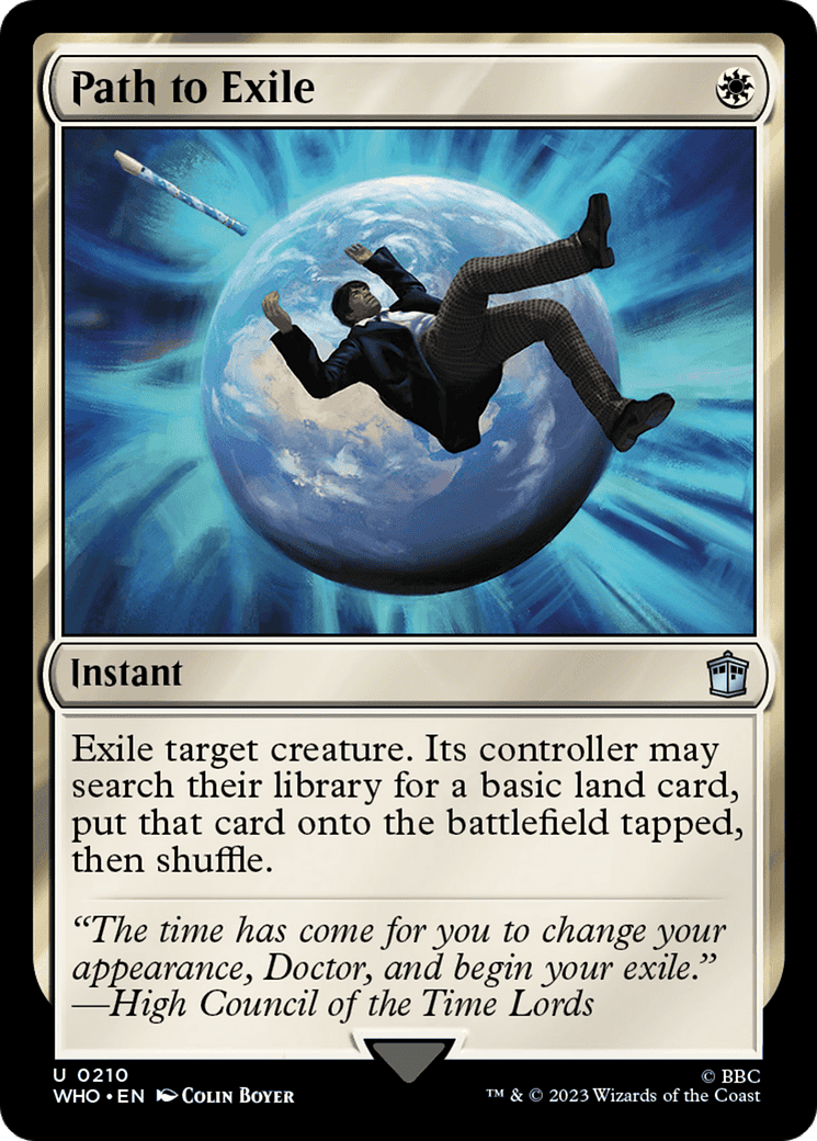 Exile target creature. Its controller may search their library for a basic land card, put that card onto the battlefield tapped, then shuffle.