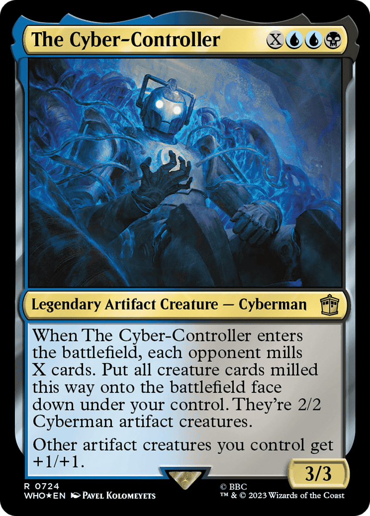 When The Cyber-Controller enters, each opponent mills X cards. Put all creature cards milled this way onto the battlefield face down under your control. They’re 2/2 Cyberman artifact creatures.