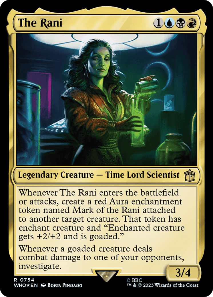 Whenever The Rani enters or attacks, create a red Aura enchantment token named Mark of the Rani attached to another target creature. That token has enchant creature and “Enchanted creature gets +2/+2 and is goaded.”