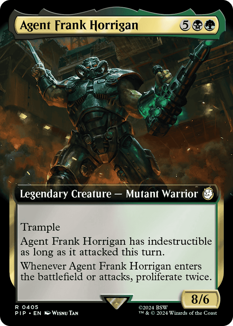 Whenever Agent Frank Horrigan enters or attacks, proliferate twice. (To proliferate, choose any number of permanents and/or players, then give each another counter of each k