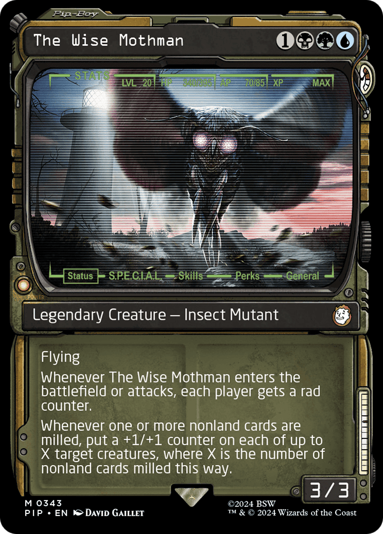 Whenever The Wise Mothman enters or attacks, each player gets a rad counter.