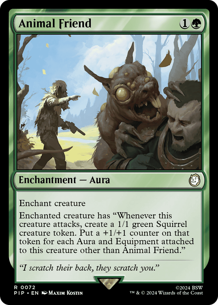 Enchanted creature has “Whenever this creature attacks, create a 1/1 green Squirrel creature token. Put a +1/+1 counter on that token for each Aura and Equipment attached to this creature other than Animal Friend.”