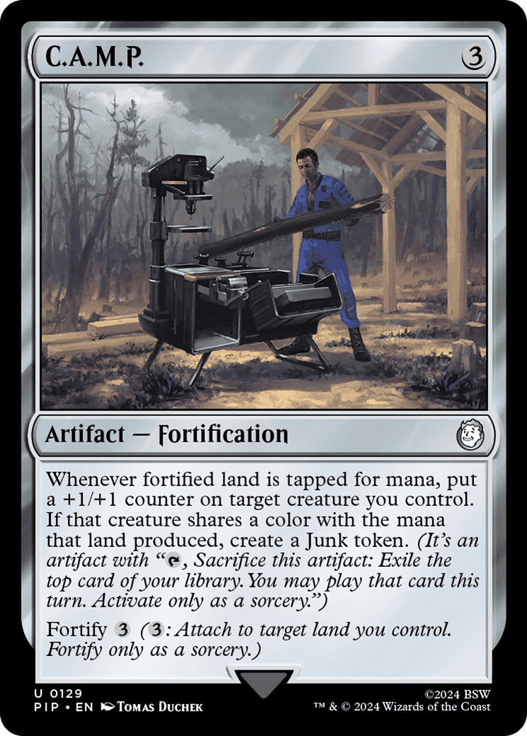 Whenever fortified land is tapped for mana, put a +1/+1 counter on target creature you control. If that creature shares a color with the mana that land produced, create a Junk token. (It’s an artifact with “{T}, Sacrifice this token: Exile the top card of