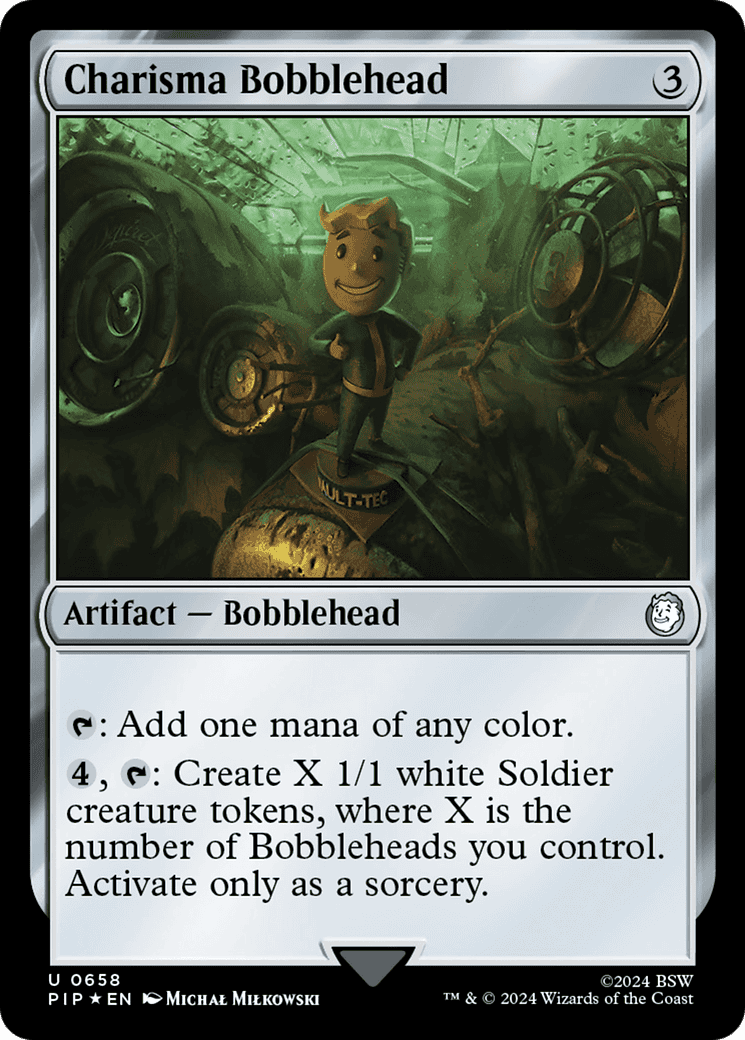 {4}, {T}: Create X 1/1 white Soldier creature tokens, where X is the number of Bobbleheads you control. Activate only as a sorcery.