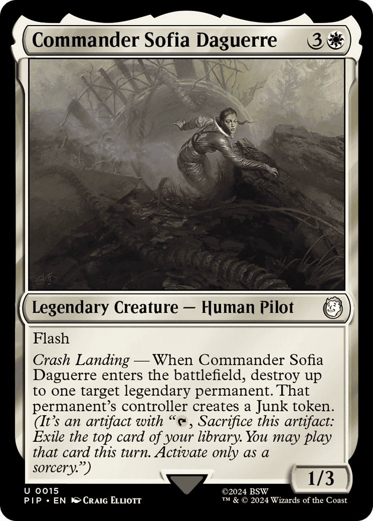 Crash Landing – When Commander Sofia Daguerre enters, destroy up to one target legendary permanent. That permanent’s controller creates a Junk token. (It’s an artifact with “{T}, Sacrifice this token: Exile the top card of your library. You may play