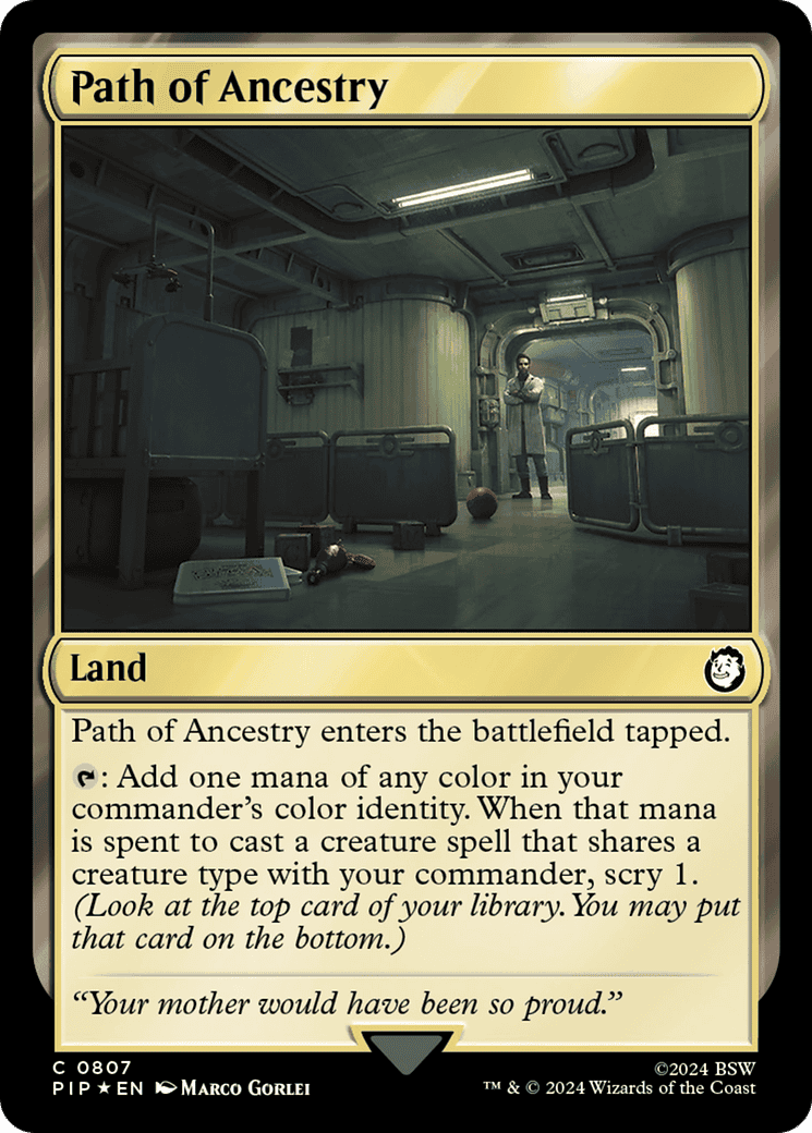 {T}: Add one mana of any color in your commander’s color identity. When that mana is spent to cast a creature spell that shares a creature type with your commander, scry 1. (Look at the top card of your library. You may put that c