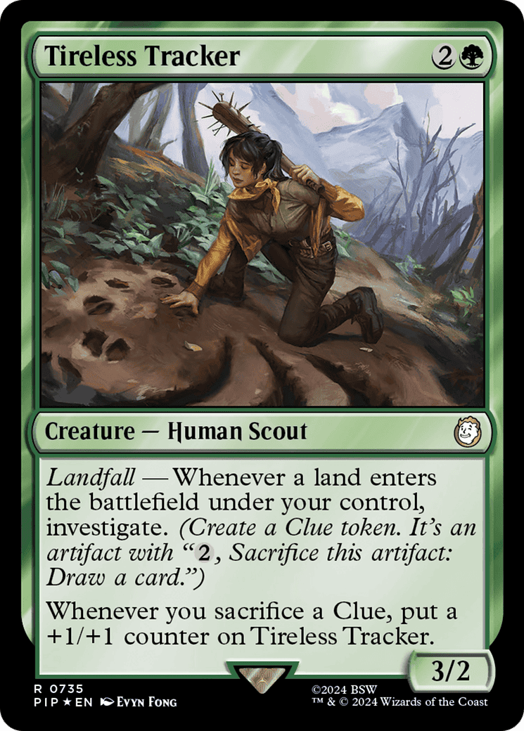 Landfall – Whenever a land you control enters, investigate. (Create a Clue token. It’s an artifact with “{2}, Sacrifice this token: Draw a card.”)