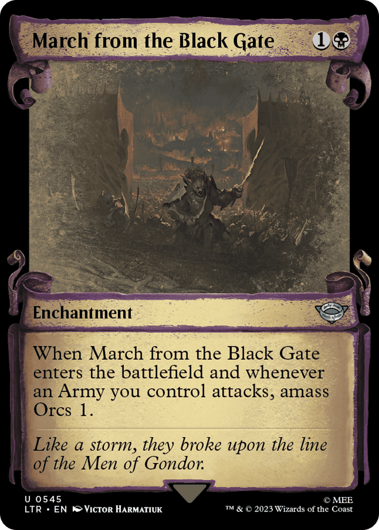 When this enchantment enters and whenever an Army you control attacks, amass Orcs 1. (Put a +1/+1 counter on an Army you control. It’s also an Orc. If you don’t control an Army, create a 0/0 black Orc Army creature token first.)