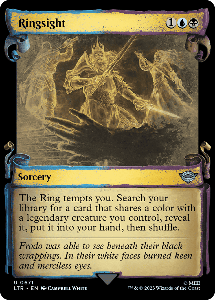 The Ring tempts you. Search your library for a card that shares a color with a legendary creature you control, reveal it, put it into your hand, then shuffle.