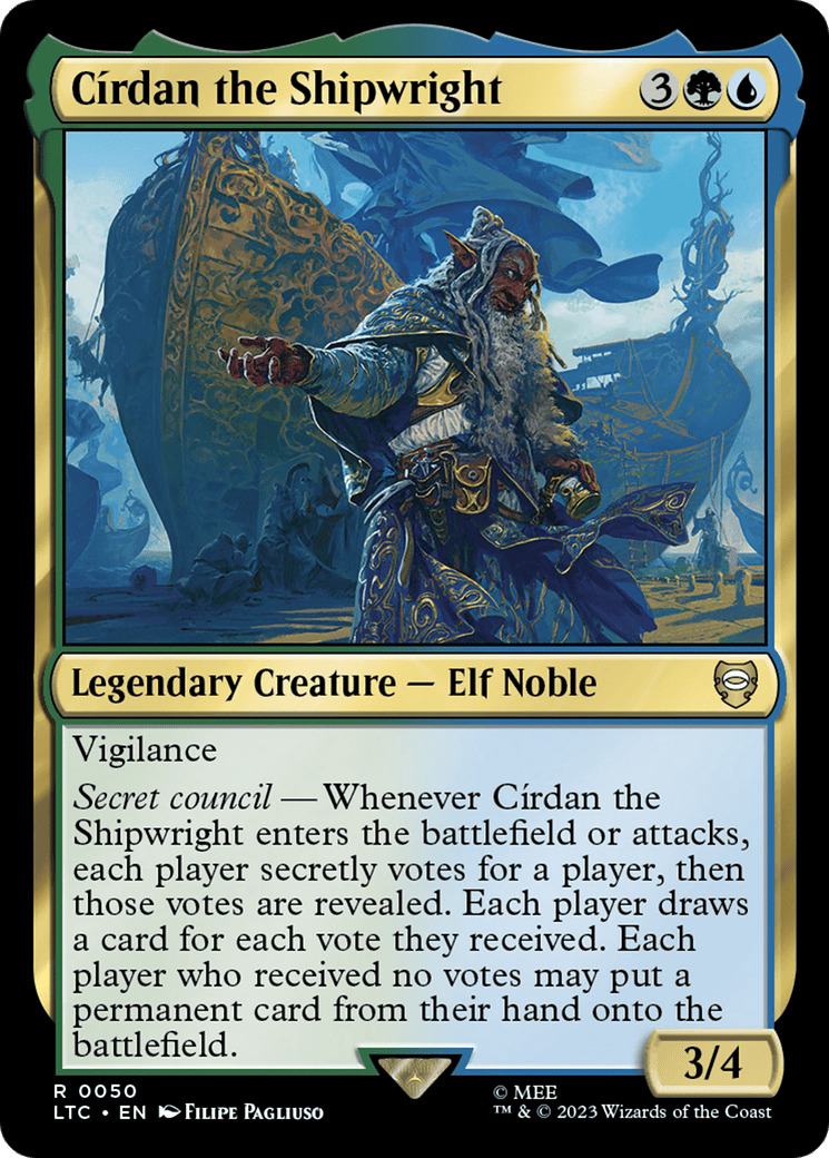 Secret council – Whenever Círdan enters or attacks, each player secretly votes for a player, then those votes are revealed. Each player draws a card for each vote they received. Each player who received no votes may put a permanent card from the
