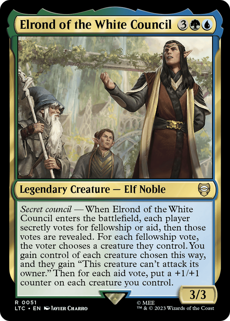 Secret council – When Elrond enters, each player secretly votes for fellowship or aid, then those votes are revealed. For each fellowship vote, the voter chooses a creature they control. You gain control of each creature chosen this way, and they gain “Th