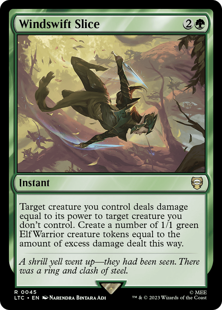 Target creature you control deals damage equal to its power to target creature you don’t control. Create a number of 1/1 green Elf Warrior creature tokens equal to the amount of excess damage dealt this way.