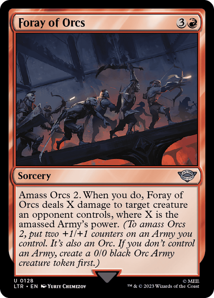 Amass Orcs 2. When you do, Foray of Orcs deals X damage to target creature an opponent controls, where X is the amassed Army’s power. (To amass Orcs 2, put two +1/+1 counters on an Army you control. It’s also an Orc. If you don’t control an Army, create a