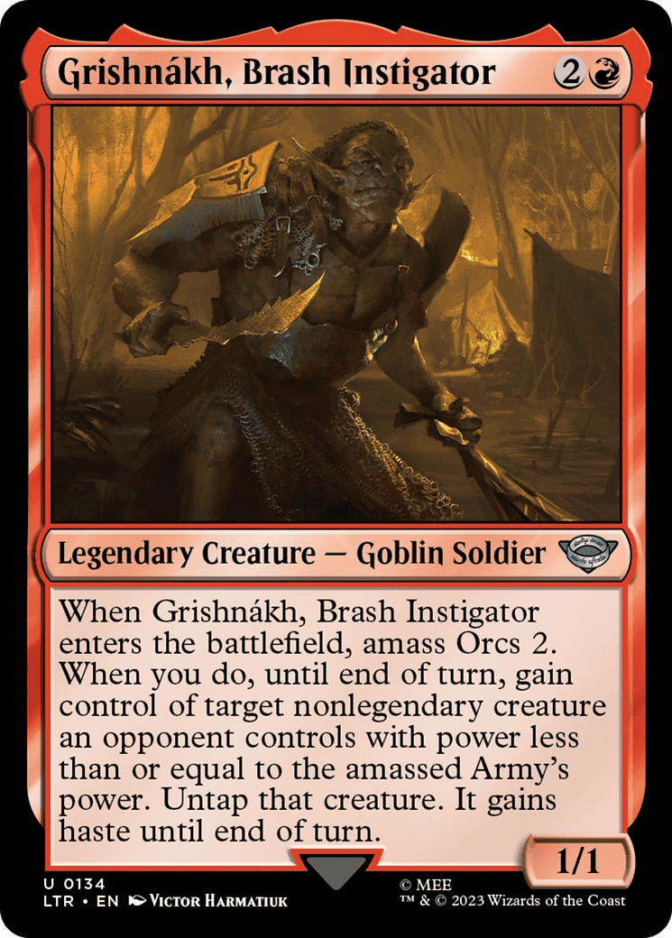When Grishnákh enters, amass Orcs 2. When you do, until end of turn, gain control of target nonlegendary creature an opponent controls with power less than or equal to the amassed Army’s power. Untap that creature. It gains haste until end of turn.