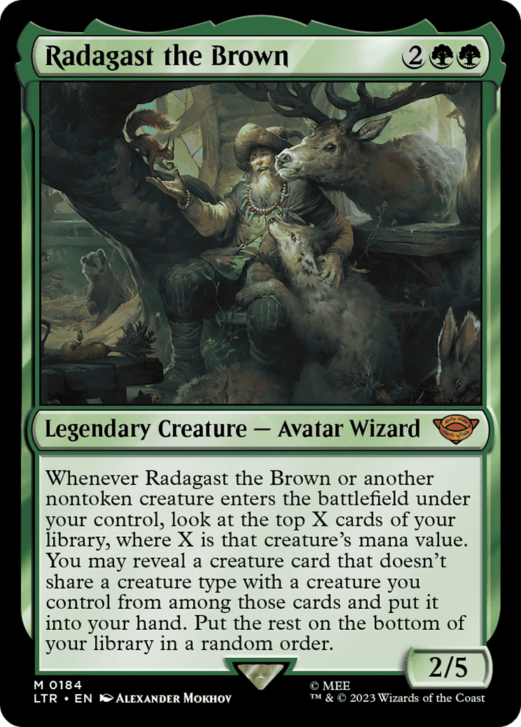 Whenever Radagast or another nontoken creature you control enters, look at the top X cards of your library, where X is that creature’s mana value. You may reveal a creature card that doesn’t share a creature type with a creature you control from among tho
