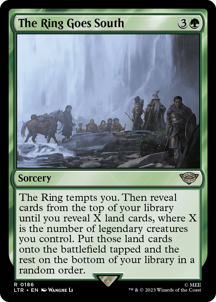 The Ring tempts you. Then reveal cards from the top of your library until you reveal X land cards, where X is the number of legendary creatures you control. Put those land cards onto the battlefield tapped and the rest on the bottom of your library in a r