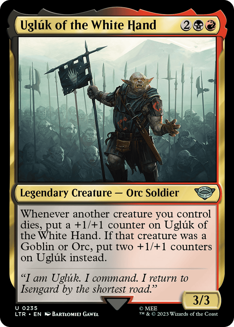 Whenever another creature you control dies, put a +1/+1 counter on Uglúk. If that creature was a Goblin or Orc, put two +1/+1 counters on Uglúk instead.