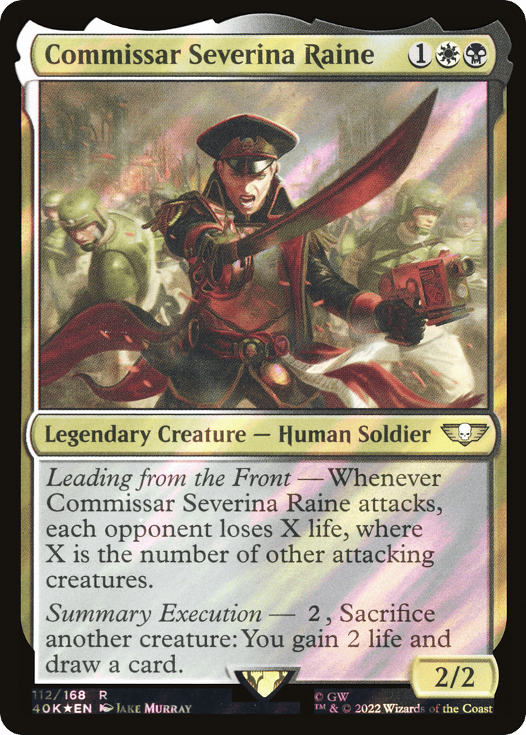 Leading from the Front – Whenever Commissar Severina Raine attacks, each opponent loses X life, where X is the number of other attacking creatures.