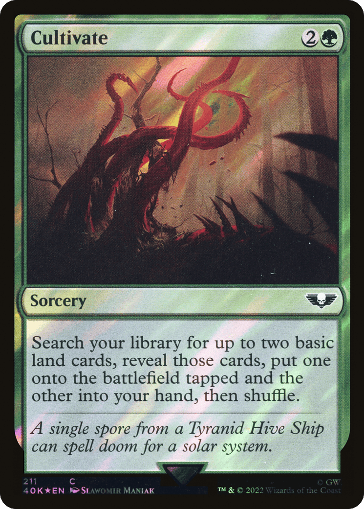 Search your library for up to two basic land cards, reveal those cards, put one onto the battlefield tapped and the other into your hand, then shuffle.