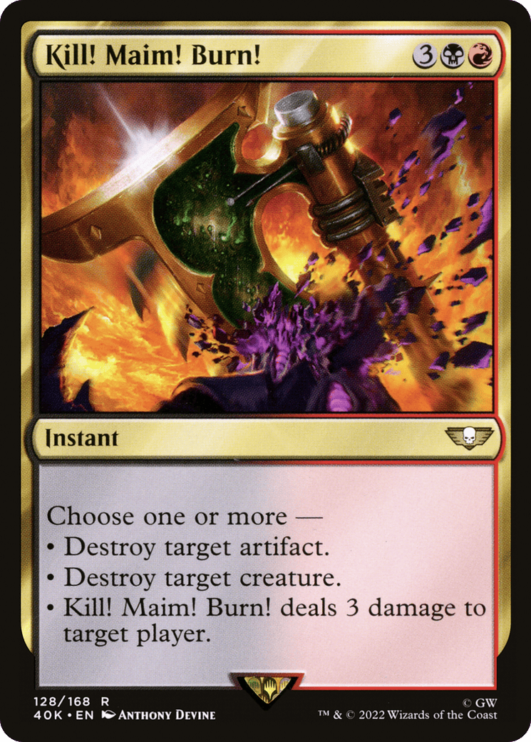 Choose one or more – – Destroy target artifact. – Destroy target creature. – Kill! Maim! Burn! deals 3 damage to target player.