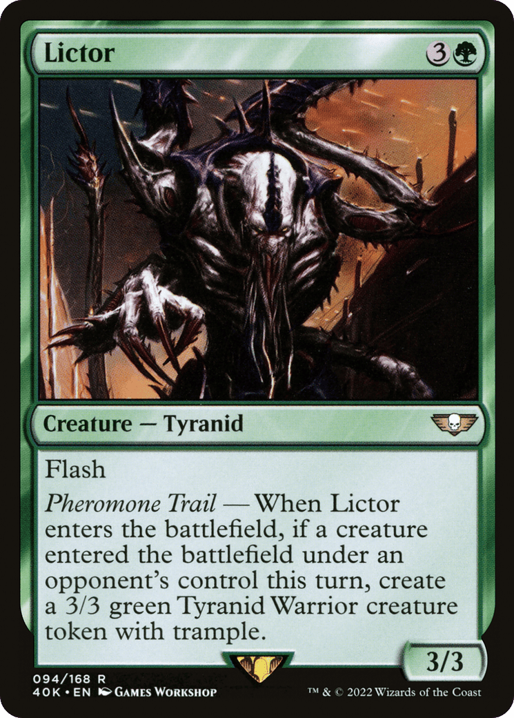 Pheromone Trail – When this creature enters, if a creature entered the battlefield under an opponent’s control this turn, create a 3/3 green Tyranid Warrior creature token with trample.