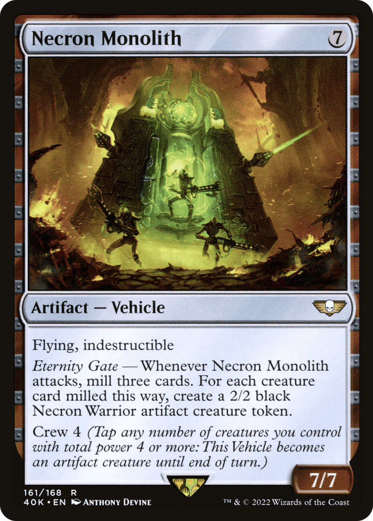 Eternity Gate – Whenever this Vehicle attacks, mill three cards. For each creature card milled this way, create a 2/2 black Necron Warrior artifact creature token.