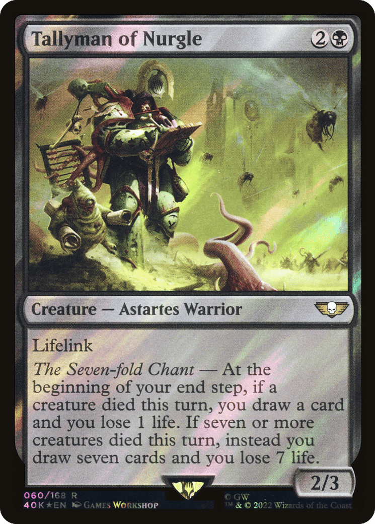 The Seven-fold Chant – At the beginning of your end step, if a creature died this turn, you draw a card and you lose 1 life. If seven or more creatures died this turn, instead you draw seven cards and you lose 7 life.
