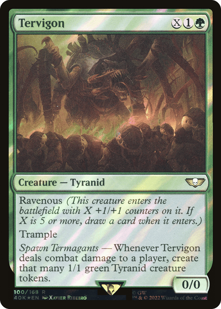 Spawn Termagants – Whenever this creature deals combat damage to a player, create that many 1/1 green Tyranid creature tokens.