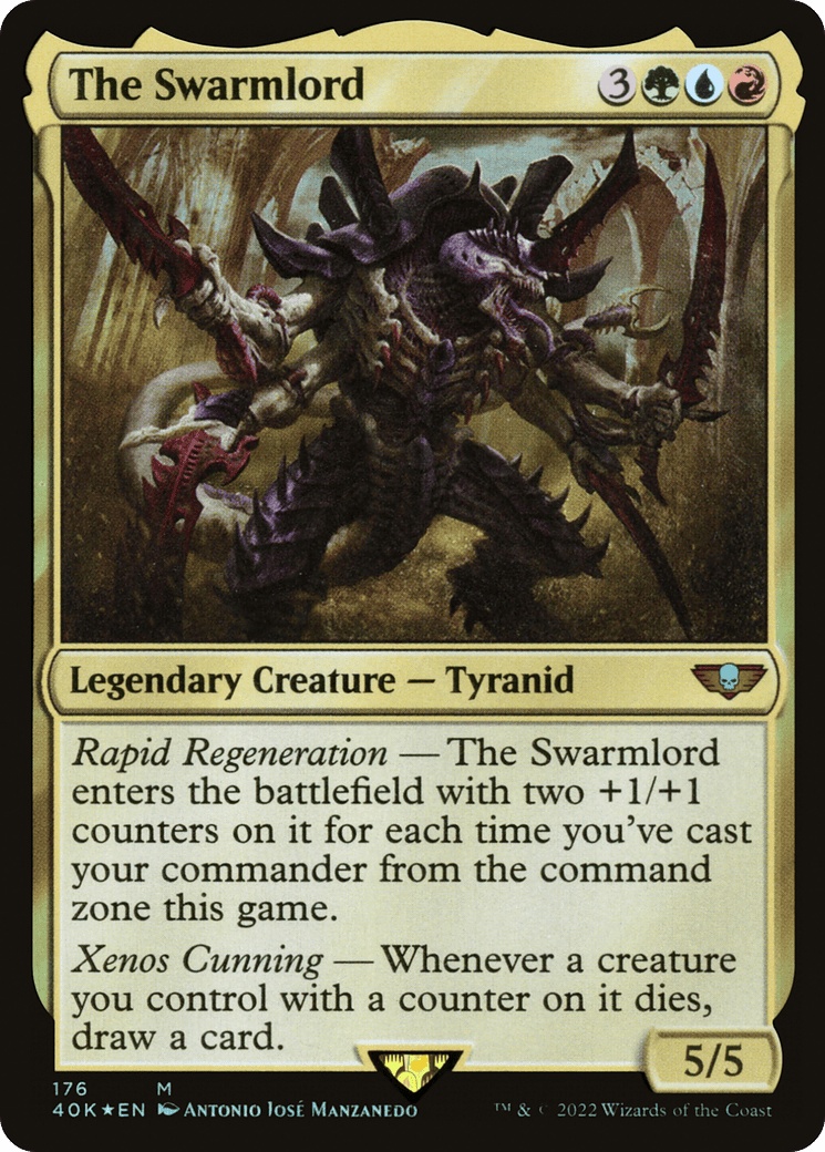 Rapid Regeneration – The Swarmlord enters with two +1/+1 counters on it for each time you’ve cast your commander from the command zone this game.