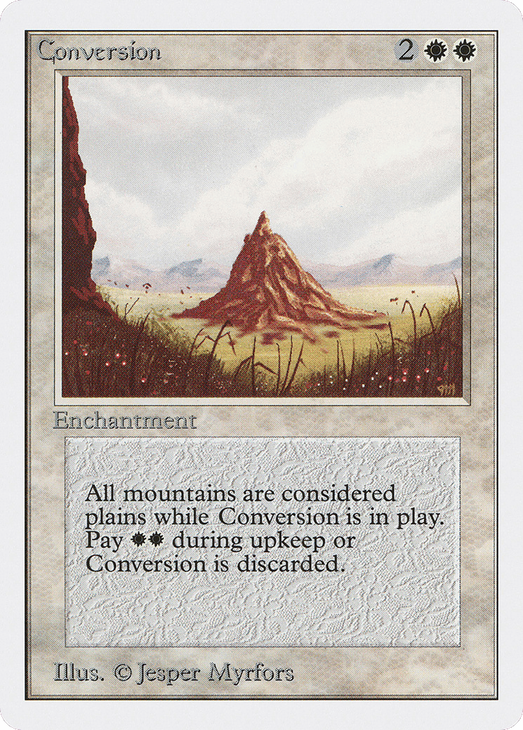 At the beginning of your upkeep, sacrifice this enchantment unless you pay {W}{W}. All Mountains are Plains.