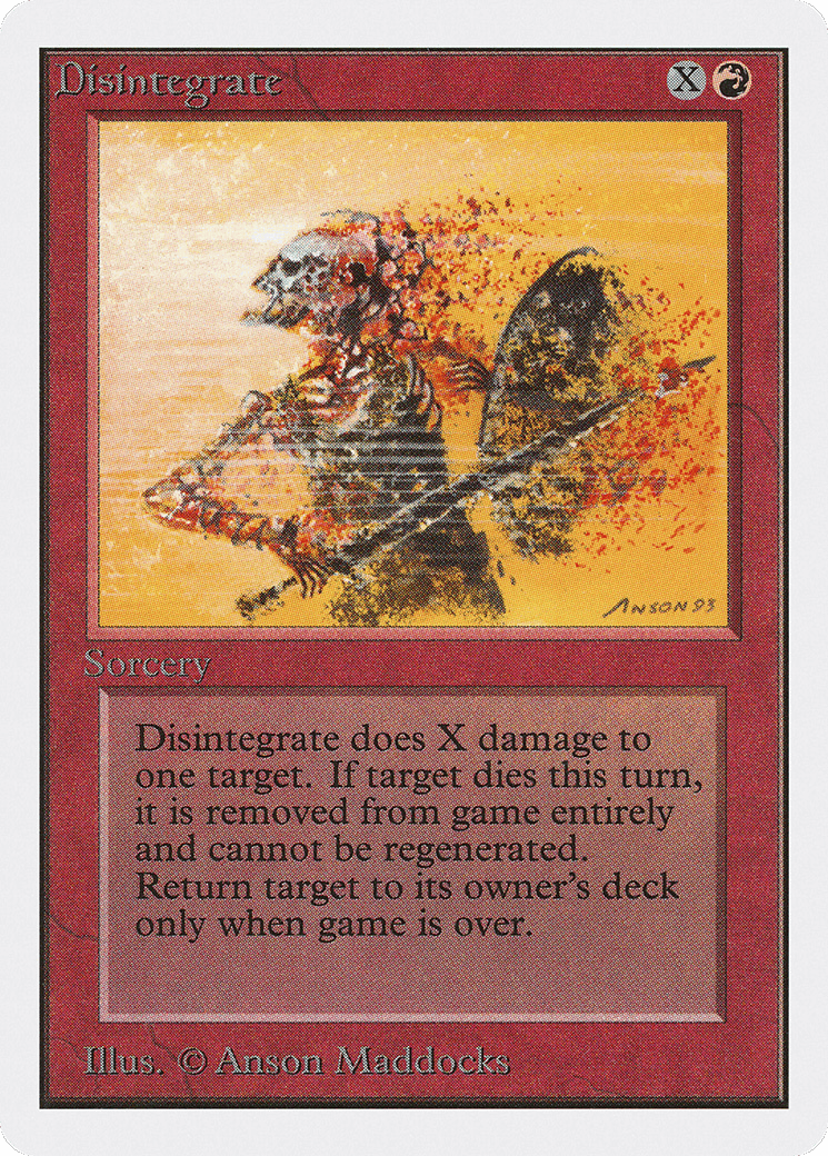 Disintegrate deals X damage to any target. If it’s a creature, it can’t be regenerated this turn, and if it would die this turn, exile it instead.