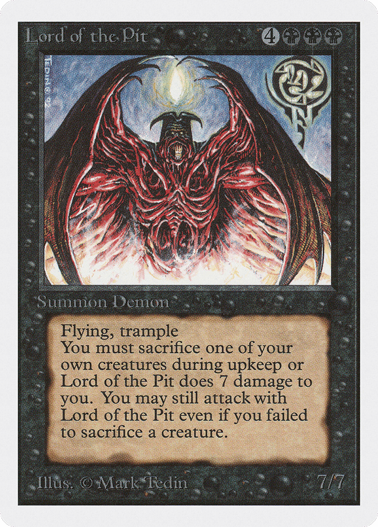 Flying, trample At the beginning of your upkeep, sacrifice a creature other than this creature. If you can’t, this creature deals 7 damage to you.