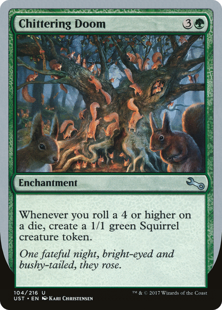 Whenever you roll a 4 or higher on a die, create a 1/1 green Squirrel creature token.