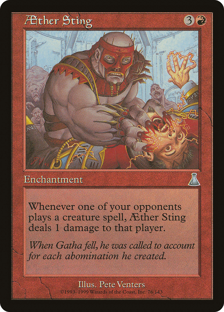 Whenever an opponent casts a creature spell, this enchantment deals 1 damage to that player.