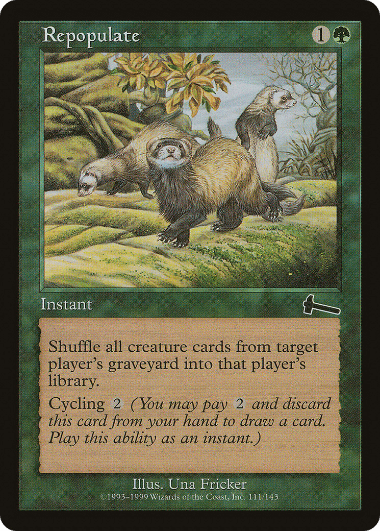 Shuffle all creature cards from target player’s graveyard into that player’s library. Cycling {2} ({2}, Discard this card: Draw a card.)