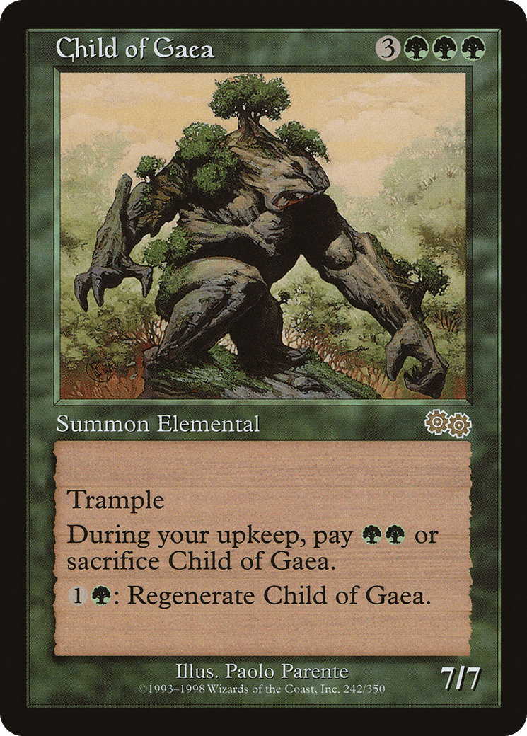 Trample At the beginning of your upkeep, sacrifice this creature unless you pay {G}{G}. {1}{G}: Regenerate this creature.
