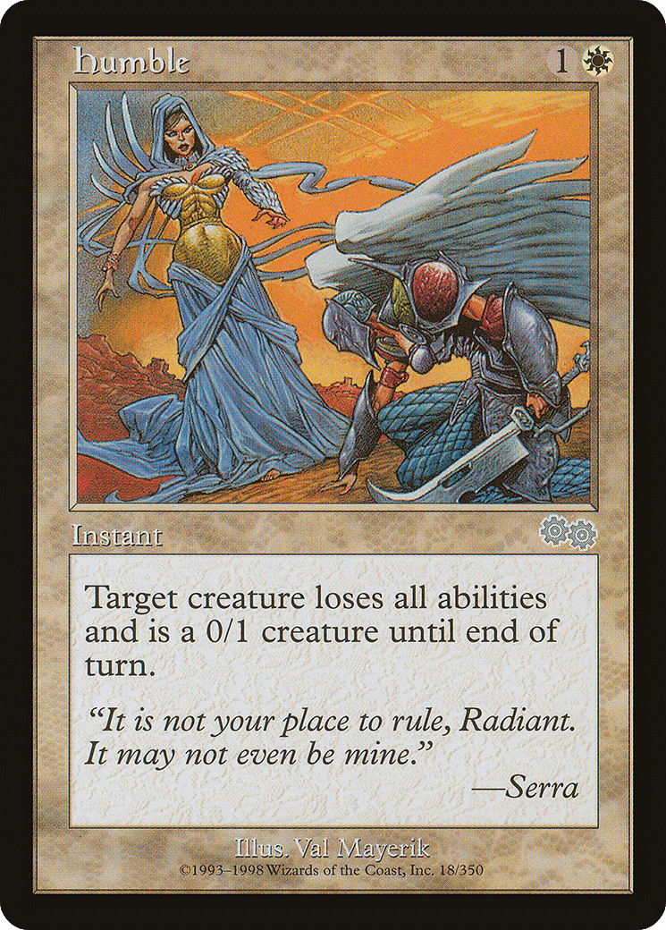Until end of turn, target creature loses all abilities and has base power and toughness 0/1.