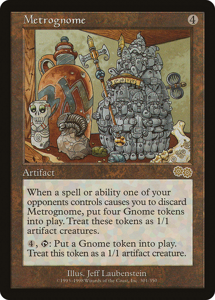 When a spell or ability an opponent controls causes you to discard this card, create four 1/1 colorless Gnome artifact creature tokens.