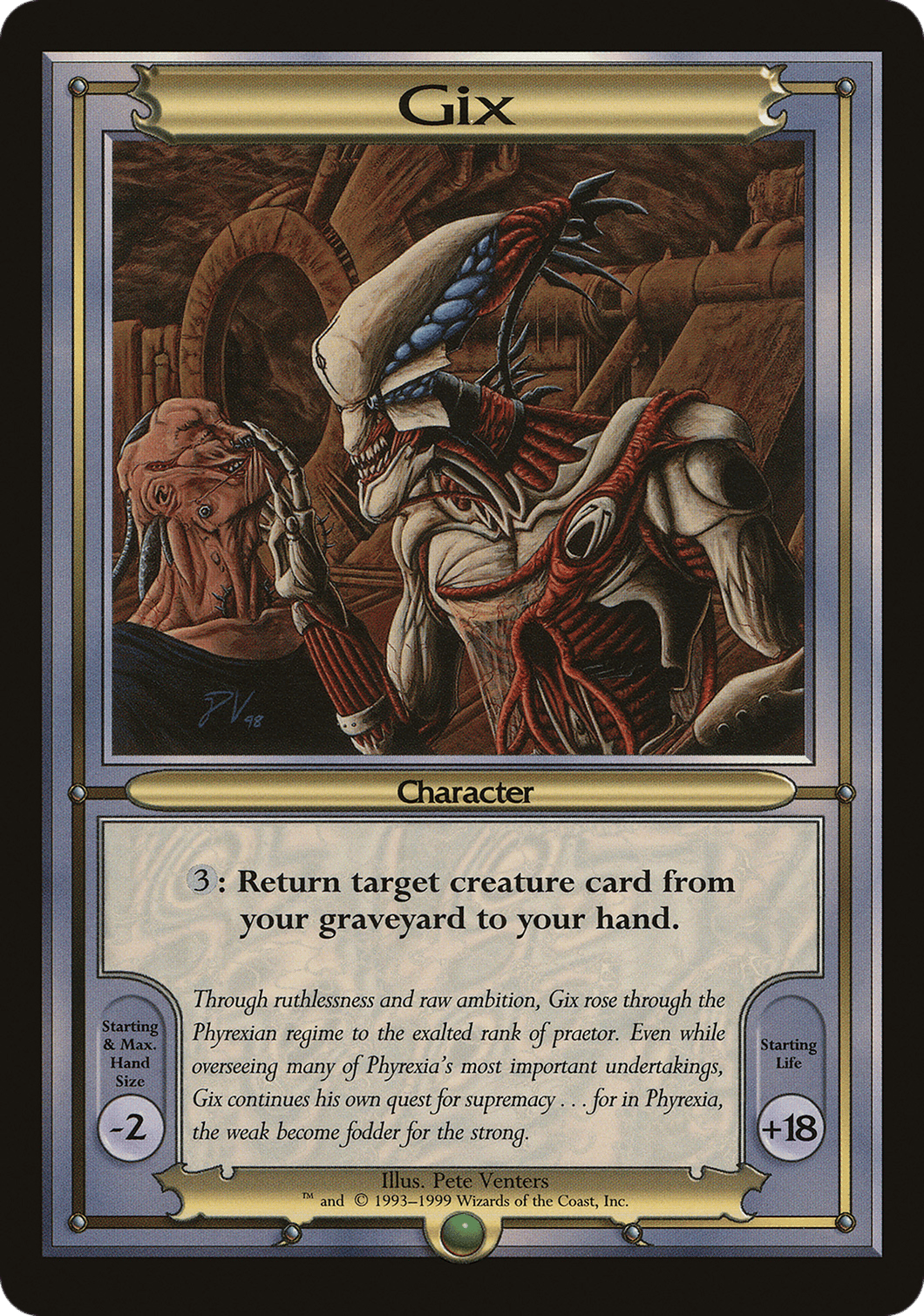 Through ruthlessness and raw ambition, Gix rose through the Phyrexian regime to the exalted rank of praetor. Even while overseeing many of Phyrexia’s most important undertakings, Gix continues his own quest for supremacy . . . for in Phyrexia, the weak be