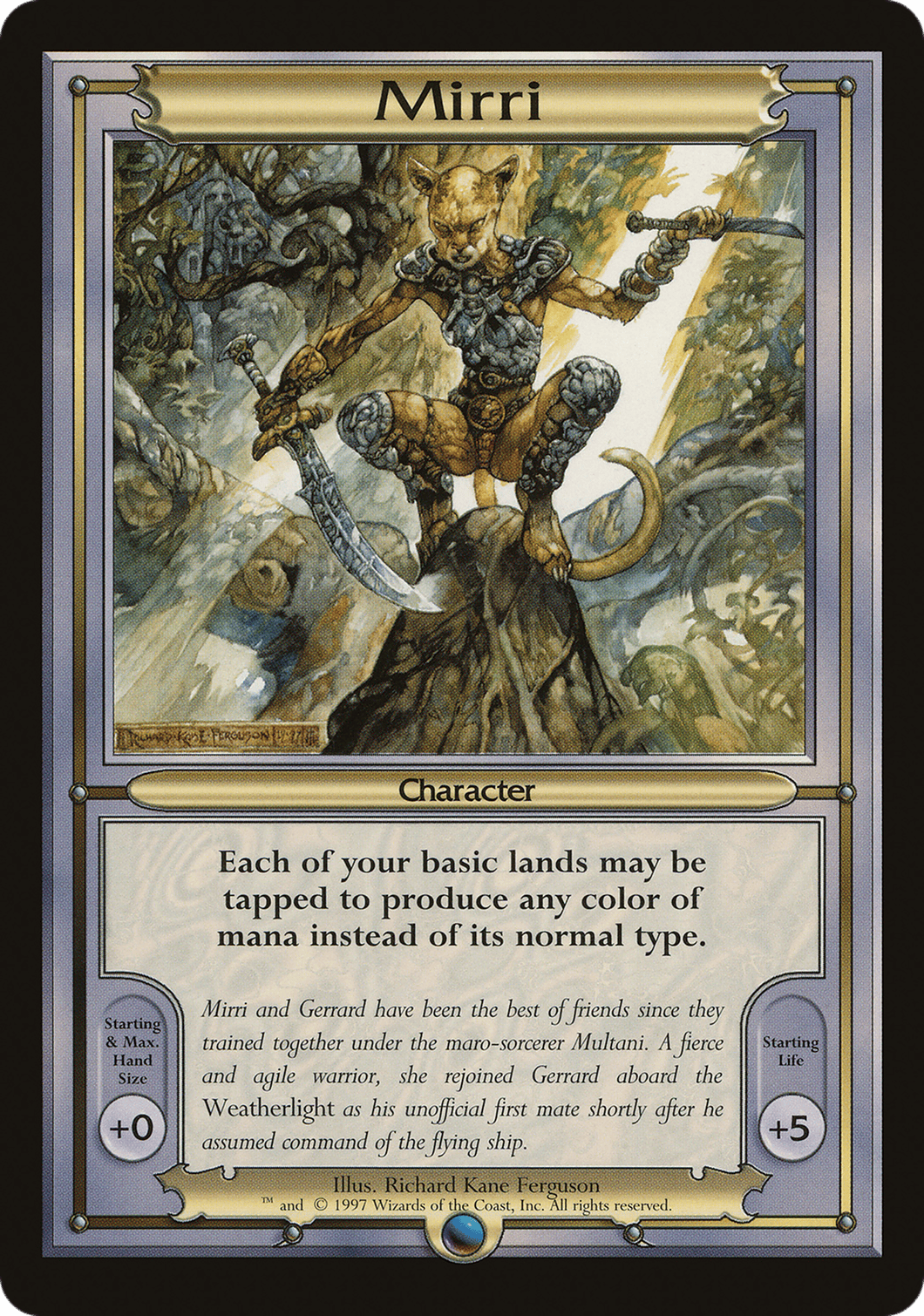 Mirri and Gerrard have been the best of friends since they trained together under the maro-sorcerer Multani. A fierce and agile warrior, she rejoined Gerrard aboard the *Weatherlight* as his unofficial first mate shortly after he assumed command of the fl