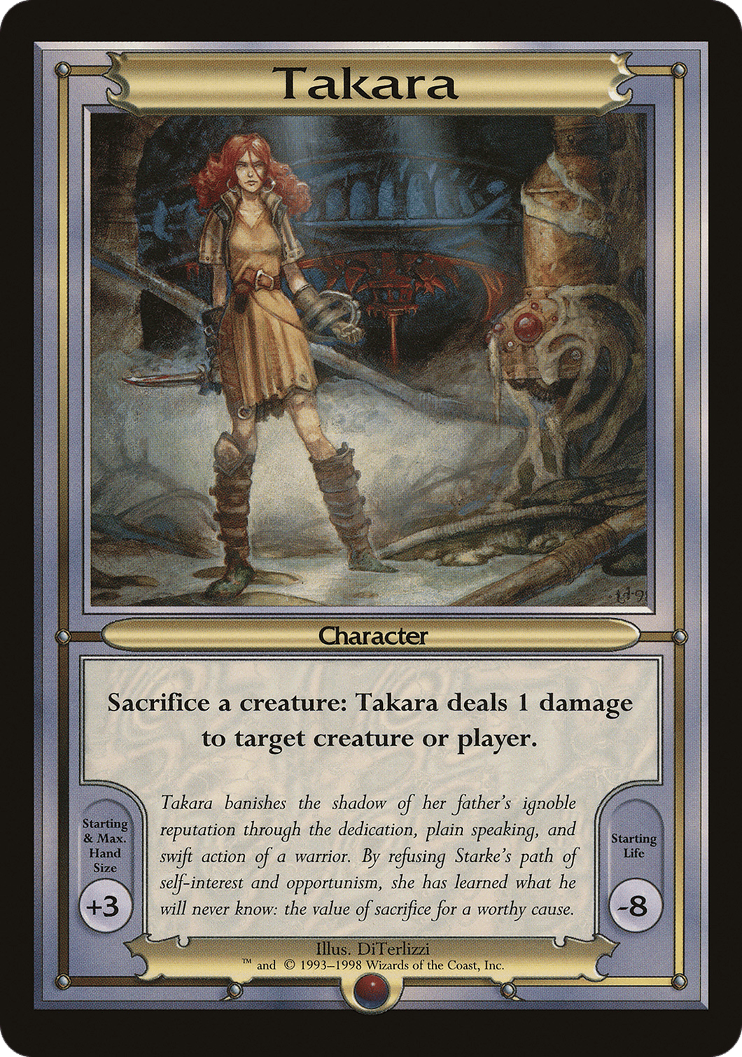 Sacrifice a creature: Takara deals 1 damage to any target.