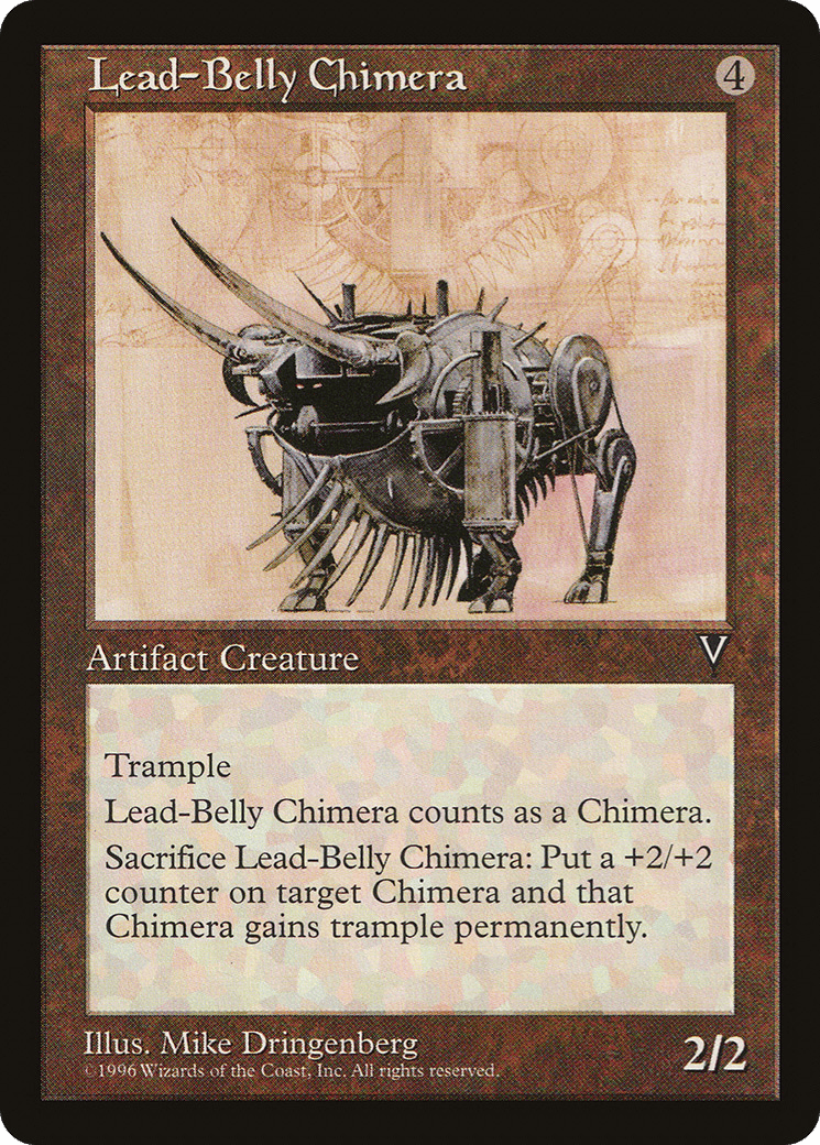 Trample Sacrifice this creature: Put a +2/+2 counter on target Chimera creature. It gains trample. (This effect lasts indefinitely.)