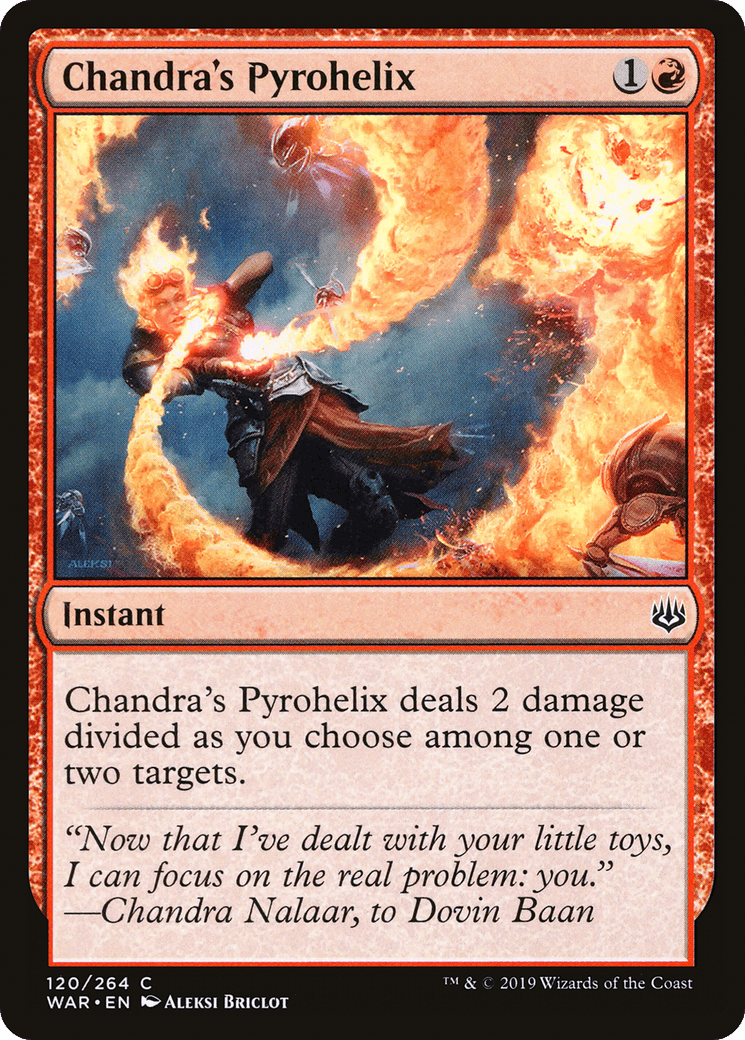 Chandra’s Pyrohelix deals 2 damage divided as you choose among one or two targets.